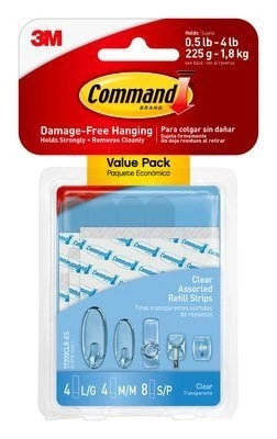 Commandâ„¢ Clear Replacement Mounting Strips make it easy to move and rehang your Commandâ„¢ Clear Products. Like all Commandâ„¢ Products, they hold strongly on a variety of surfaces, including tile, wood, metal and painted surfaces. Yet they also remove cleanly – no holes, marks, sticky residue or stains. Commandâ„¢ Clear Refill Strips come in small, medium and large sizes. Also a great for replacement for double sided sticky tape.