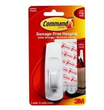 Forget about nails, screws and tacks, Commandâ„¢ Hooks are fast and easy to hang! Using the revolutionary Commandâ„¢ Adhesive, holds strongly on a variety of surfaces, including paint, wood, tile and more. Yet, removes cleanly – no holes, marks, sticky residue or stains.