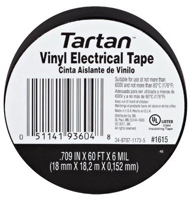 Tartan Vinyl Electrical Tape is a good quality and economical general purpose vinyl insulating tape. It has excellent resistance to: abrasion, moisture, alkalies, acid and varying weather conditions (including sunlight). It is a polyvinyl chloride (PVC) tape that has a high wet dielectric strength, is conformable, and provides excellent mechanical protection with minimum bulk