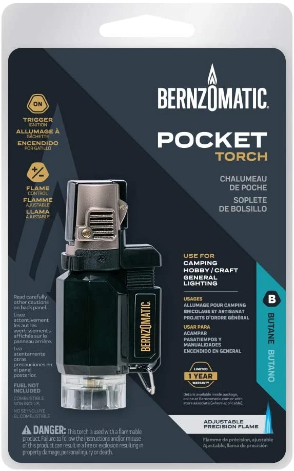 The Bernzomatic Pocket Torch is our most compact torch, complete with a keychain attachment, so you can store in a tackle box or tool kit or carry along on your pack. The Pocket Torch uses a precision flame with a trigger-start ignition and is ideal for everyday household use such as lighting grills, pilot lights and fireplaces. This torch is compatible and refillable with the Bernzomatic BF56 Butane Cylinder, sold separately. Limited 1-Year Warranty.
