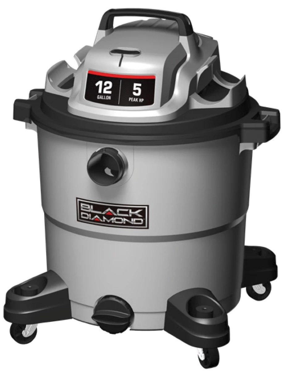 12 Gallon 5.0HP Wet/Dry Vac with blower function and hose storage integrated hose storage 12 Ft. cord with cord wrap easily converts to blower extra large drain port storage on power head large on/off dust sealed switch.