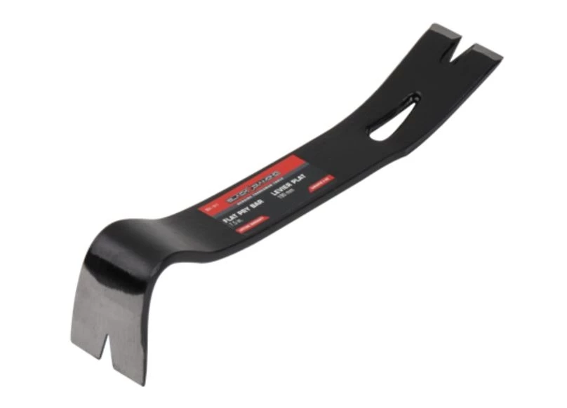 For tough prying lifting, levering, and nail pulling. Hardened strength spring steel with rust resistant powered coating. Standard flat pry with a straight claw end and a bent claw end for extra leverage. Wide, flat shaft allows entry into tight spaces more easily and the distributed force lessens the risk of damage to lifted objects.