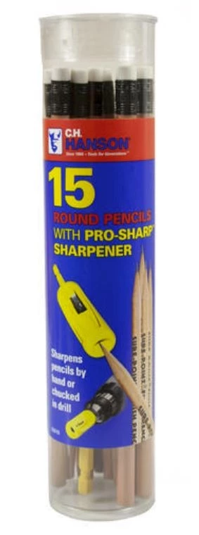 15 Pack of top quality #2 pencils and a Pro-Sharp pencil sharpener in a re-useable tube. Round pencils are perfect for fine carpentry marking and hold a sharp point. Pencil sharpener can be used by hand or can be chucked in a drill to become the fastest sharpener in your shop.