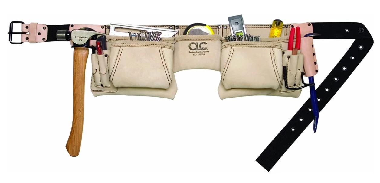 - 12 total pockets: 4 main nail and tool pockets and 8 smaller pockets for nail sets, pencils, and pliers