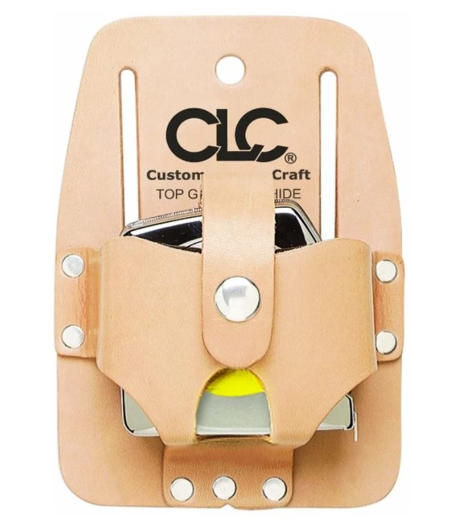 A superior quality, heavy duty measuring tape holder with a snap-closure safety strap and easy-out keel, for measuring tapes up to 30′.