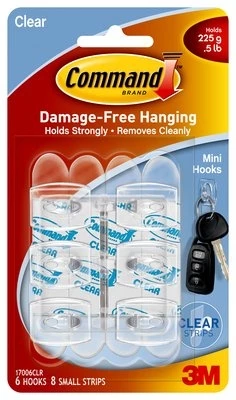 Forget about nails, screws and tacks, Commandâ„¢ Clear Hooks are fast and easy to hang! The revolutionary Commandâ„¢ Clear Adhesive Strip holds strongly on a variety of surfaces, including paint, wood, tile and more. Yet, removes cleanly – no holes, marks, or sticky residue. Commandâ„¢ Clear Hooks and Strips blend in seamlessly allowing you to show what matters most, your decor, not how it’s hung up. Rehanging them is as easy as applying a replacement Commandâ„¢ Clear Strip, so you can take down, move and reuse them again and again!
