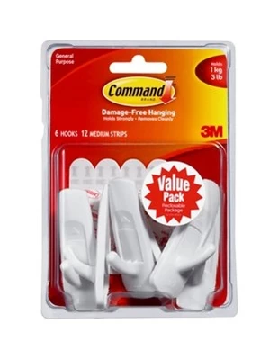 Command™ Hooks are available in a wide range of designs to match your individual style and decor. They also come in a variety of sizes and hold a surprising amount of weight – up to seven and a half pounds! Forget about nails, screws and tacks, Command™ Hooks are fast and easy to hang! Using the revolutionary Command™ Adhesive, holds strongly on a variety of surfaces, including paint, wood, tile and more. Yet, removes cleanly – no holes, marks, sticky residue or stains. Rehanging them is as easy as applying a replacement Mounting™ Strip, so you can take down, move and reuse them again and again! Contains 6 hooks, 12 strips. Holds up to 3 pounds