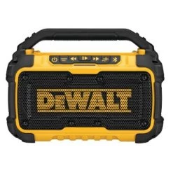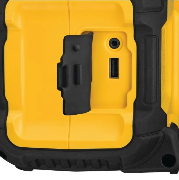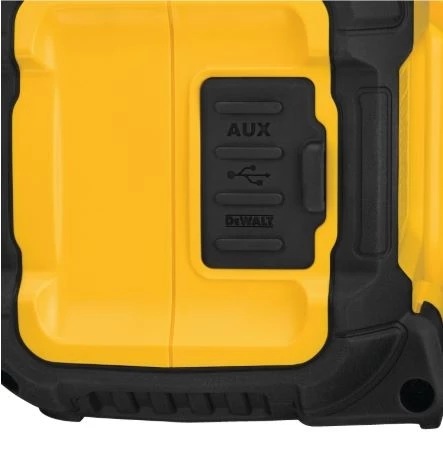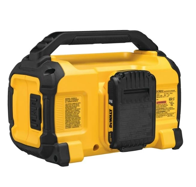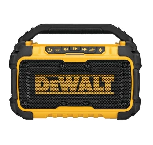 This Bluetooth speaker is jobsite tough and produces high-quality sound. Enhance your workday by streaming your favorite music or podcasts from your Bluetooth® equipped mobile device from up to 100 ft. away. You can also plug devices directly in with the auxiliary input. Charge your phone through the day with an integrated USB charging port. Stand your mobile phone in the slot of the built-in carry handle, or underneath. Enjoy rich stereo sound with extended bass from dual 3 in. speakers. Its rugged design includes a metal grille and impact-resistant housing. Power the Jobsite Bluetooth® Speaker with DEWALT 12V MAX*, 20V MAX*, or FLEXVOLT® batteries, all sold separately. Includes universal AC cord. Comes with 3-year limited warranty.