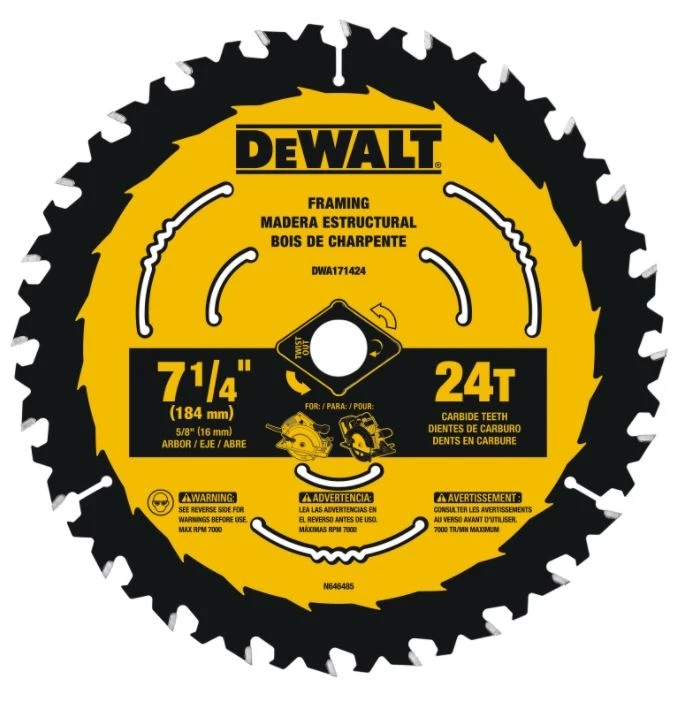 DEWALT Saw Blades are ideal for any wood-cutting application. The exclusive, patent-pending ToughTrack™ tooth design, on our framing & ripping blades, is engineered to deliver straight, accurate cuts over the life of the blade. Patented Body Slots reduce vibration, which works with the blade’s thin kerf design to deliver exceptional user feel. High-Density Tungsten Carbide teeth are tough, wear-resistant, and provide long life. The reinforced shoulder is designed for strength & durability by providing impact resistance, especially in nail-embedded wood. These blades come with ToughCoat™ anti-stick coating to reduce friction and gumming. Optimized for use on both corded and cordless circular saws.