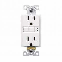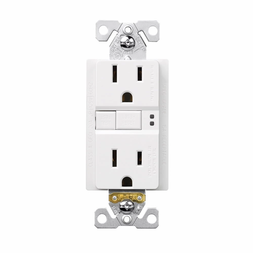 GFCIs provide protection from dangerous electrical shocks that might occur from faulty appliances or tools, wet or damp locations. Automatically self-test periodically to ensure GFCI protection. End of Life lockout and denial of power. NO power delivered if miss-wired. Ground fault circuit interrupters self-test amps/volts=15/125 color=white Automatic testing GFCI receptacle. If no GFCI protection is present, the receptacle will render itself inoperable and a red indicator light will glow.