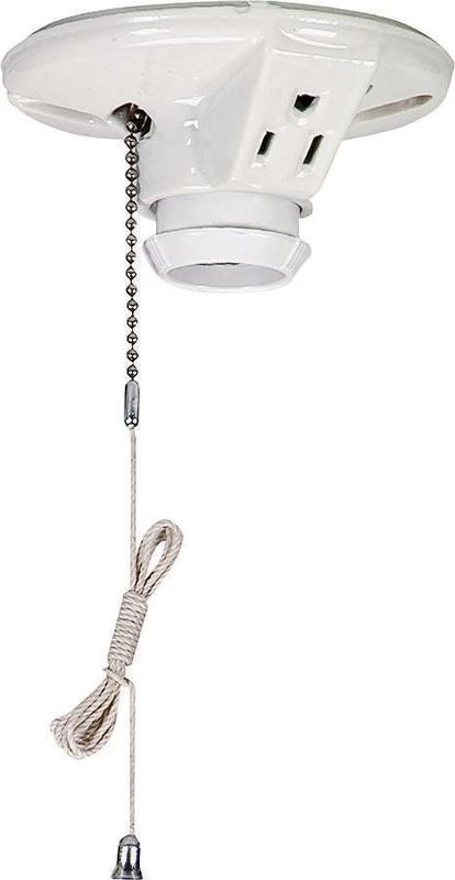 Eaton Porcelain Lamp Holder with 125 volt AC outlet and Pull Chain has 15 amp 125 volt AC outlet. High-strength insulator porcelain. Mounts on 4 outlet boxes with breakout for 3-1/4 box mounting. Pull chain socket interior is removable. Includes ball chain 3 of cord connector and end bell. Terminal screws are backed out ready for wiring without removing the interior. Dust ring protects against plaster and dirt.