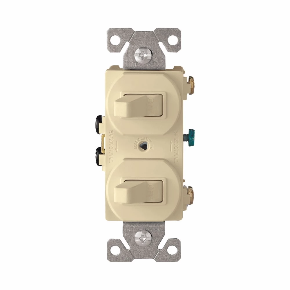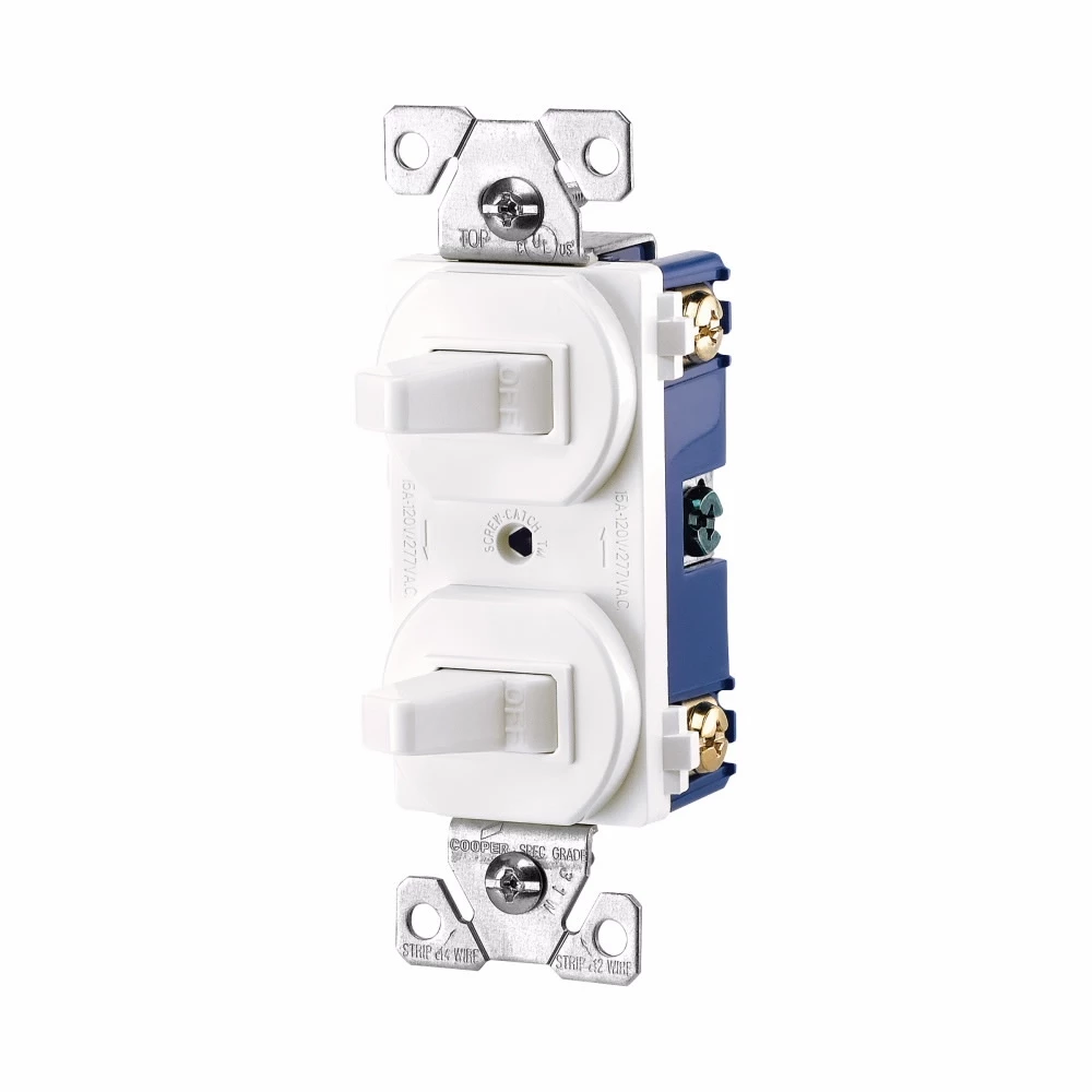 Eaton commercial grade combination switch, Stand, #14 – #12 AWG, 15A, Commer, 120/277V, bk and sd wiring, toggle, Maint closure, Screw, Brass, -20-60?C, (2) 1-pole, duplex, thermoplastic