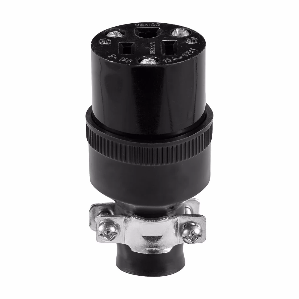 | 2-Prongs | Eaton straight blade connector, #18-10 AWG, 15A, Commercial, 125V, Back wire, Black, Brass, Thermoplastic, 1-15R, Two-pole, two-wire, non-grounding, Screw, Thermoplastic rubber, ED Box |