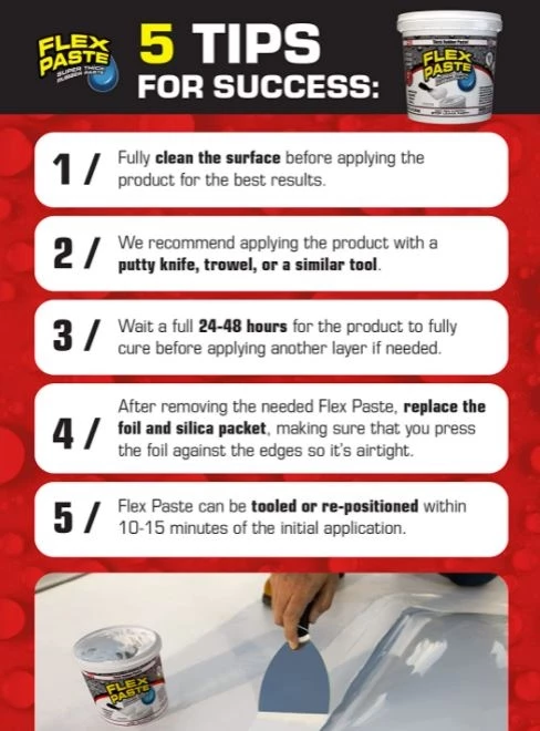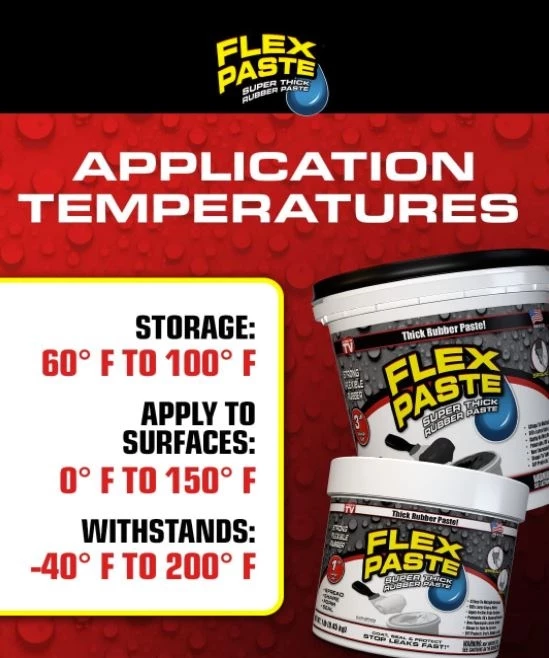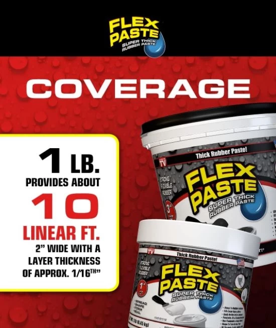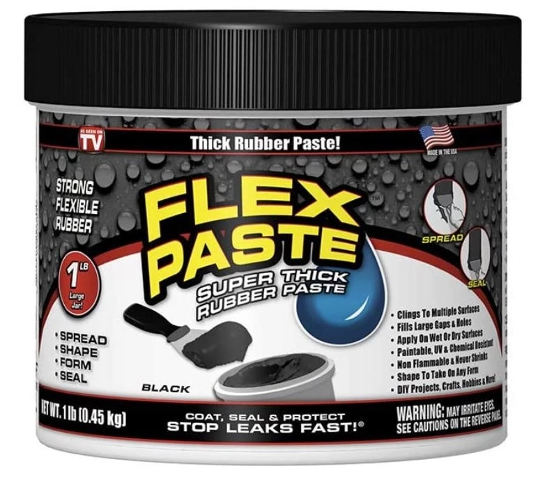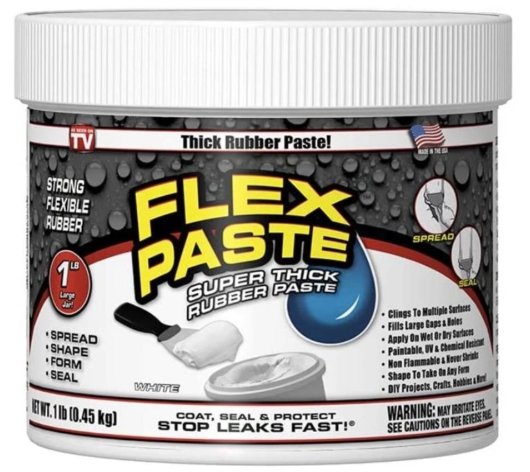 Flex paste is a super thick rubberized paste you can use to spread, shape, form and seal virtually everything. Flex paste starts out as a thick paste and dries to a strong, flexible, rubber coating. It can be applied to all types of surfaces to seal out air, water and moisture. It clings to the surface and instantly fills large gaps, cracks and holes. It won’t shrink or wash away and can be painted any color. Flex paste can be applied on dry or wet surfaces, even underwater. Flex paste clings to a wide variety of surfaces and will work on wood, glass, tile, concrete, aluminum, metal, brick, stucco, masonry, copper, fabric, fiberglass, ceramic, porcelain, natural stones, roofing, PVC, EIFS, EPDM, CSPE, Hypalon polyurethanes and so much more.