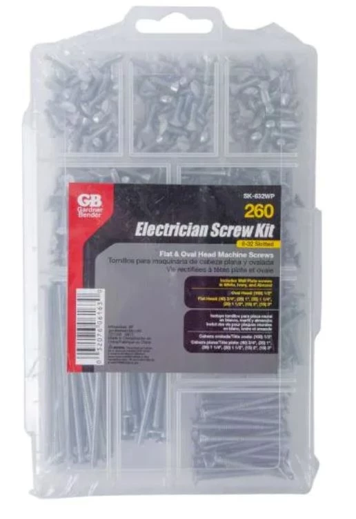 This electrician’s screw kit includes 260 flat and oval head 6-32 slotted machine screws suitable for a wide variety of everyday uses including outlet and standard junction box installations. It also comes with white, almond and ivory wall plate screws. Stored in a convenient container to keep all of the screws organized.