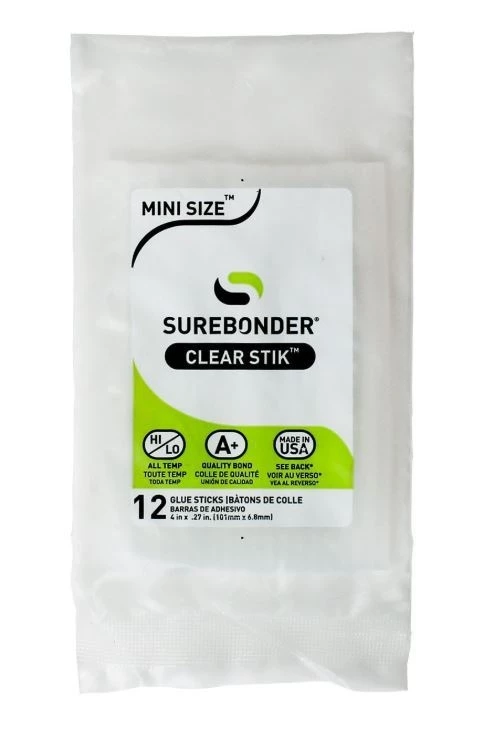Surebonder All Temperature Mini Glue Sticks is an all-temperature hot melt adhesive that works at either low temperature (230 degrees F) or high temperature (380 degrees F). For use in everyday gluing projects. Use with high or low temperature glue guns. Bonds to metal, wood, paper, fabric, magnets, ceramics, floral arrangements, glass, and plastic using a high temperature glue gun. Bonds to delicate materials such as balloons, ribbon, lace, and children’s crafts using a low temperature glue gun. Clear color with 60-65 second working time.