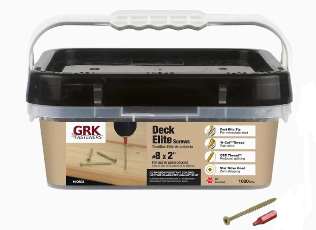 GRK Deck Elite screws provide a quick drive and clean finish in wood decking top boards. With GRK’s Fast Bite Tip, Deck Elite screws start immediately in wood. The patented W-CutTM thread design allows for a smooth, fast drive to increase productivity on the job, and the tan color of the screw provides an ideal finish. GRK Deck Elite screws have a corrosion resistant coating to resist rust and keep decks looking like new.