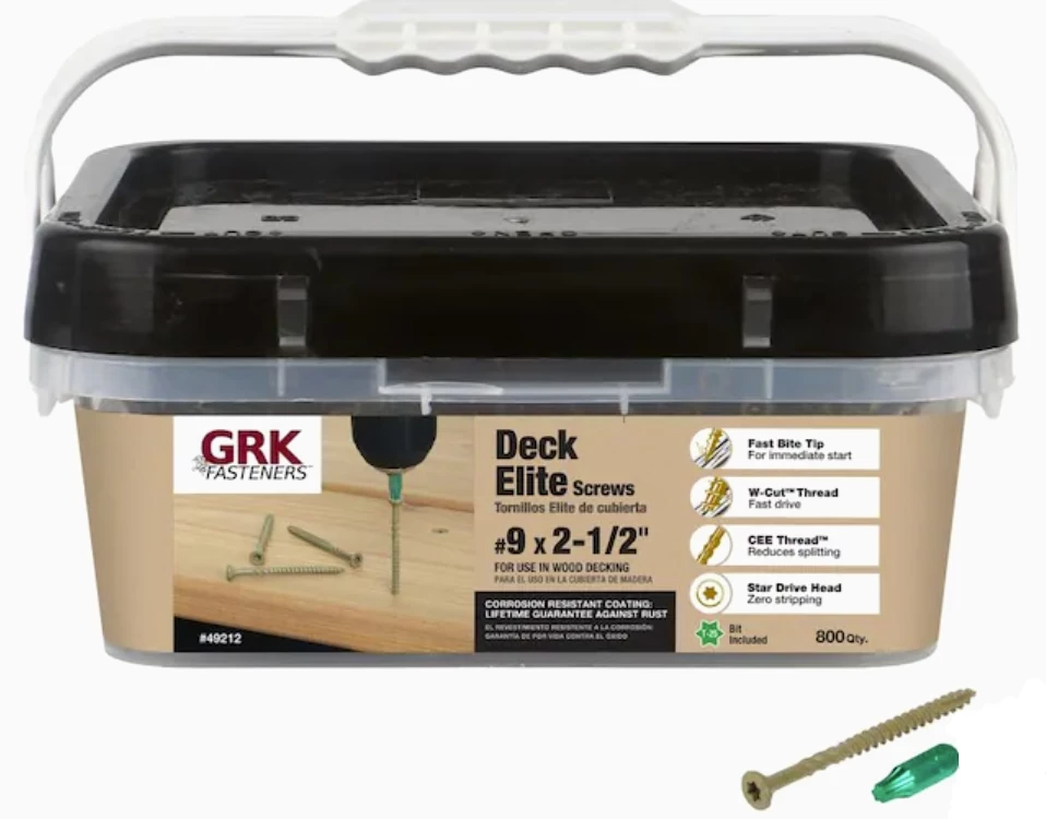 GRK Deck Elite screws provide a quick drive and clean finish in wood decking top boards. With GRK’s Fast Bite Tip, Deck Elite screws start immediately in wood. The patented W-CutTM thread design allows for a smooth, fast drive to increase productivity on the job, and the tan color of the screw provides an ideal finish. GRK Deck Elite screws have a corrosion resistant coating to resist rust and keep decks looking like new.