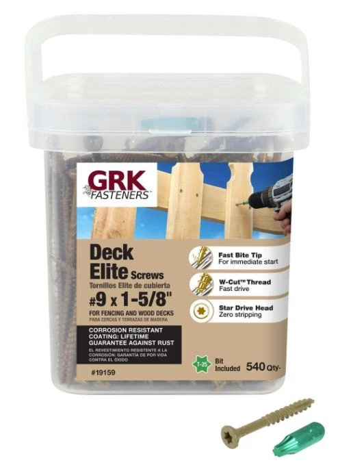 GRK Deck Elite delivers superior productivity with its Fast Bite Tip and patented W-Cut thread form for a quick start and easy drive. The CEE-thread ensures a successful drive with no wood splitting and reduces friction/heat buildup on the screw, resulting in elimination of head pops. Pros and homeowners alike will enjoy the ideal aesthetic of a clean, finished look with Deck Elite’s color match.