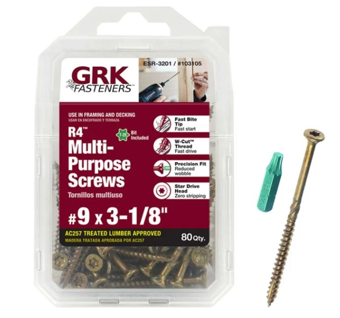 GRK Fasteners’ R4 Multi-Purpose Framing and Decking screws provide a faster drive for improved productivity. Typical applications include multi-purpose general framing, remodeling, decking topboards and structural framing applications. R4 Screws can be used in wood, particle-board, plastic, sheet metal, cement fiber board, wood decking, composite decking and melamine. Frame with Ease and Confidence with the R4 Multi-Purpose framing and decking screws.