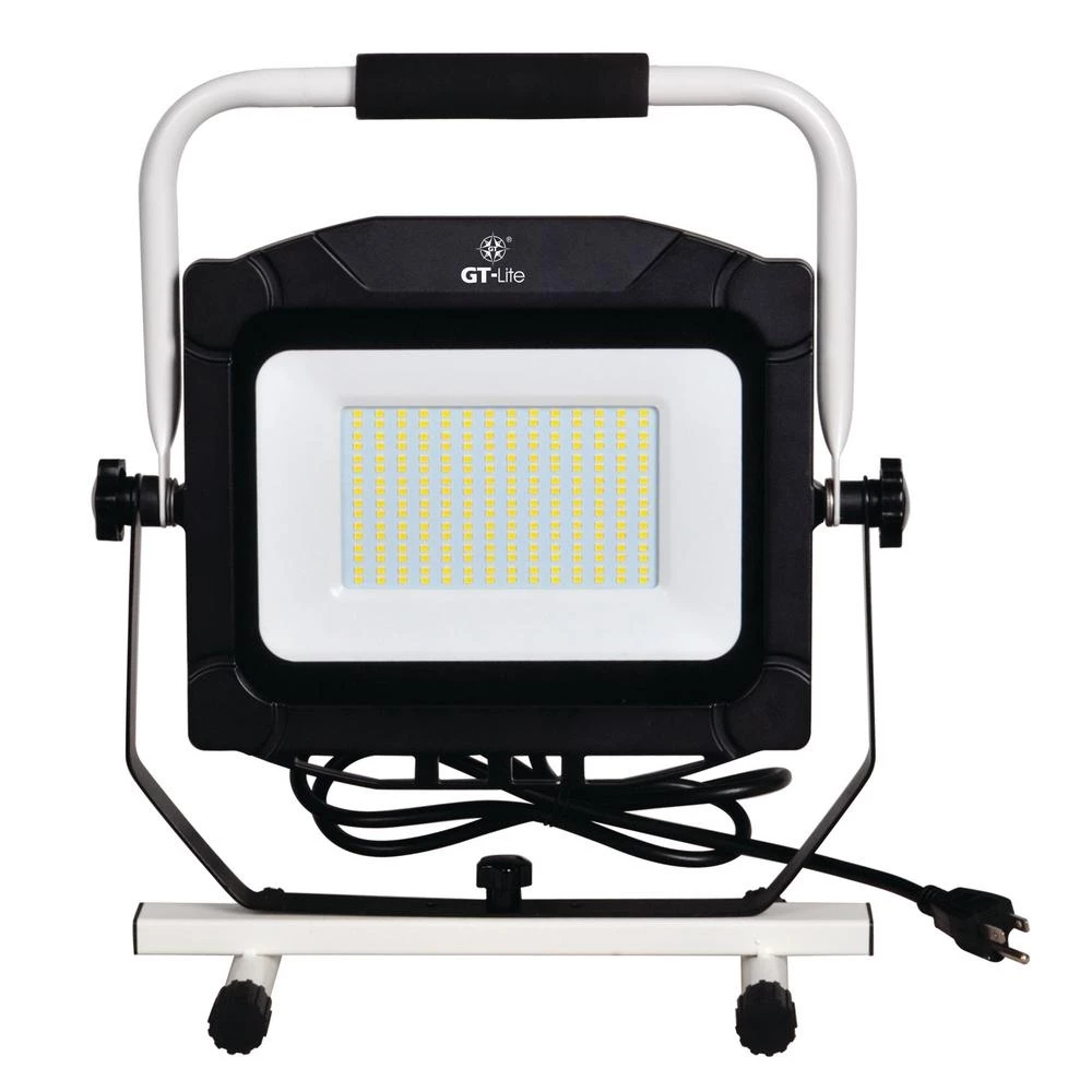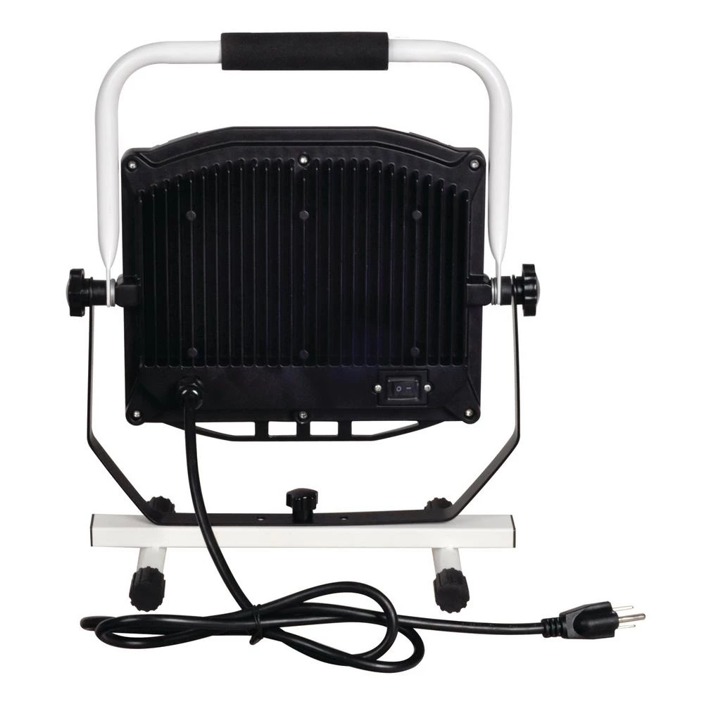 Provide 10,000 Lumens of bright light from a single work light. With innovated slim design and 6 ft. grounded power cord this mighty light is purpose built for portability. The pivoting adjustable head and soft-grip handle allows for accurate light placement while the aluminum H-stand keeps the light steady. Energy efficient LED technology is rated for 50,000 lifetime hours with zero required maintenance, all while using about 90% less energy than a halogen equivalent light.