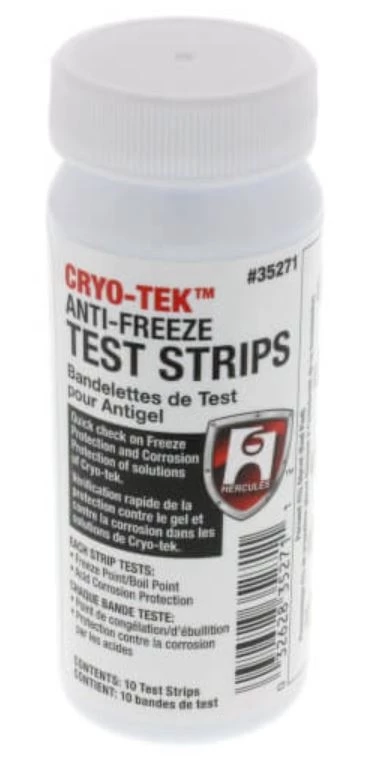 Contains 10 color-coded disposable test strips. Each one simultaneously checks level of propylene glycol and level of corrosion protection. Freeze protection levels and corrosion protection levels should be checked annually. Add additional cryo-tek product if freeze protection is inadequate. Add cryo-tek Universal Inhibitor if pH is below 8.5.
