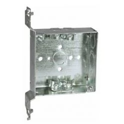 Hubbell 4 in. Square Box that is made of a welded steel construction with “FS” bracket to mount on the flat side of the stud and nonmetallic sheathed cable clamps and is 1 1/2″ Deep.TKO® Knockouts allow for design and installation flexibility. This box is supplied with three 1/2 in. and one 1/2-3/4 in. TKO® knockouts.