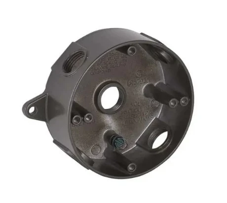Hubbell Round Weatherproof Box with Five 1/2 in. Threaded Outlets are constructed out of Rugged die-cast aluminum. State-of-the-art powder coat finish provides maximum weather ability and scratch resistance. Includes Four 1/2 in. closure plugs and Ground screws pre-installed. Internal hub threads comply with NEMA requirements and will accept all threaded fittings and threaded conduit.