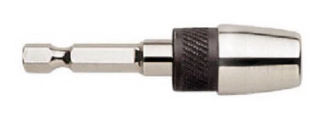 Spade drill bit extensions quick change -hex shank”lock-n-load” lgth. 2 inch Carbon steel construction sleeve and body. Jaw design holds bits securely on 6-flatted shanks, as well as ball detent bits and the 1/4 inch Quick Change range now holds insert bits; magnetic for holding. Lock-n-Load system for one handed quick release.