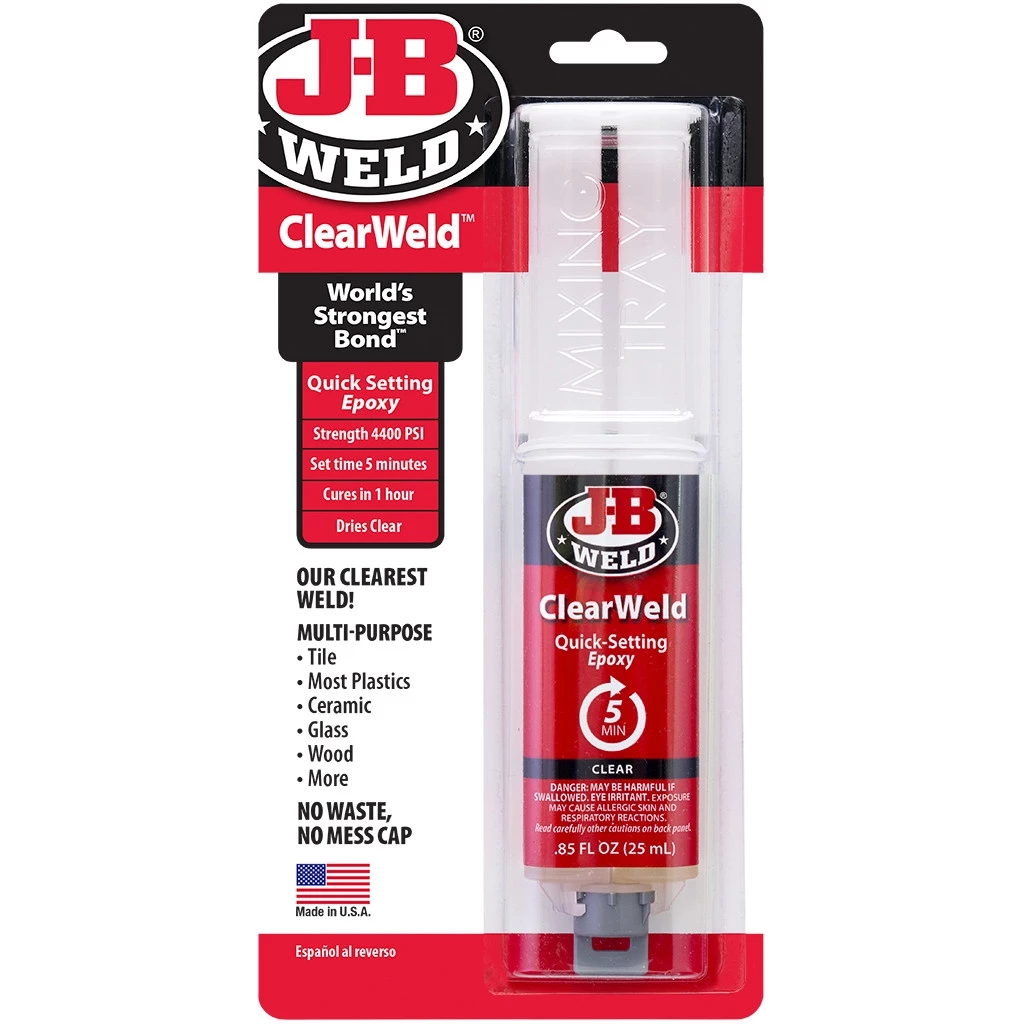 ClearWeld is a quick setting, multipurpose two part epoxy that provides a strong and lasting bond on most surfaces including tile, most plastics, ceramic, glass, wood and metal. ClearWeld is designed to cure with a clear, transparent bond when used at thicknesses of less than 15 mil. ClearWeld has a 1:1 mixing ratio, sets in 5 minutes and cures in 1 hour. With a tensile strength of 4400 PSI, ClearWeld sets to a hard, permanent bond.