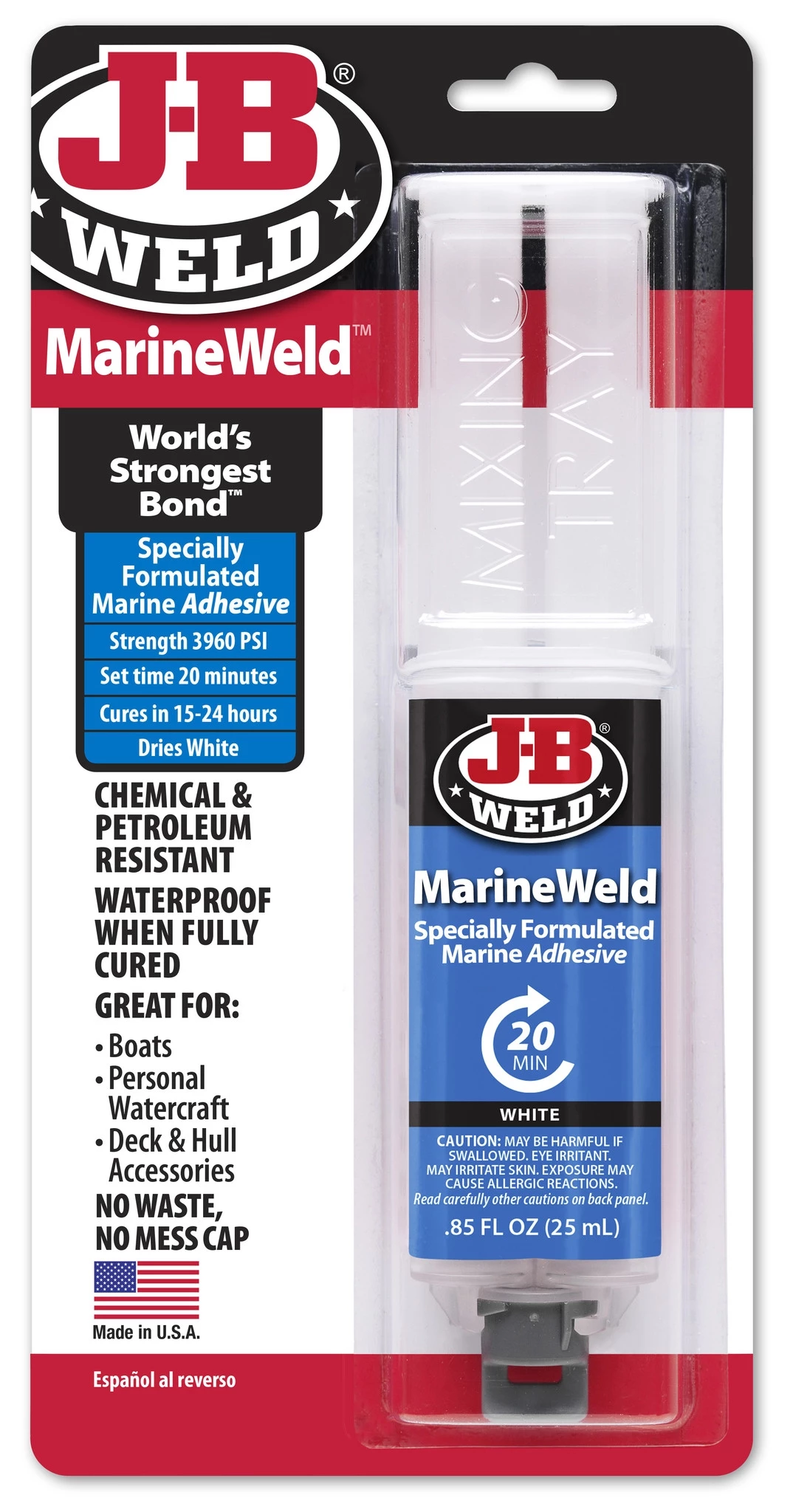 J-B MarineWeld is a specially formulated two part Cold-Weld adhesive system that provides strong, lasting repairs for bonding different or similar surfaces, such as metal, composites, fiberglass and others. MarineWeld sets in 20 minutes at room temperature. At full cure, its color is white. It may then be shaped, tapped, filed, sanded and drilled, retaining full strength above or below the waters’ surface. MarineWeld has a 1:1 mixing ratio and tensile strength of 3200 PSI.