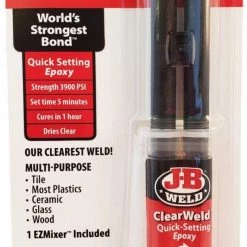 ClearWeldâ„¢ is a quick setting, multipurpose two part epoxy that provides a strong and lasting bond on most surfaces including tile, most plastics, ceramic, glass, wood and metal. ClearWeldâ„¢ is designed to cure with a clear, transparent bond when used at thicknesses of less than 15 mil. ClearWeldâ„¢ has a 1:1 mixing ratio, sets in 5 minutes and cures in 1 hour. With a tensile strength of 3900 PSI, ClearWeldâ„¢ sets to a hard, permanent bond.