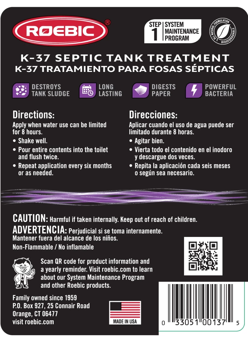 Biological activity in septic tanks is easily thrown out of balance when excessive water, harmful detergents or other harmful chemicals enter the system. K-37 Septic Tank Treatment is specifically designed to restore the natural balance within septic tanks by promoting the efficient and rapid breakdown of solids, thereby reducing sludge and scum levels and resulting in reduced odors, less clogs and more efficient system operation.