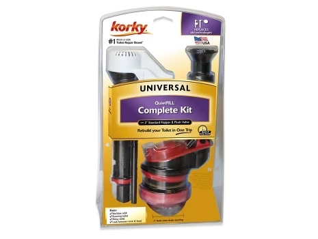 The Korky Complete Toilet Repair Kit allows for a full overhaul of your toilet in one trip and is designed to fix no/slow refilling, running, and noisy toilets. The complete kit includes a fill valve, flush valve, flapper, and tank-to-bowl hardware. The Korky QuietFILL Toilet Fill Valve is quieter than other fill valves. It has a universal design to fit all brands and features a wide range of adjustability to fit most toilets. Also included is an Easy Adjust 2 inch flush valve that’s fully adjustable, no hack-saw required. The flapper is made from exclusive longest lasting red rubber that resists chlorine, bacteria, city water treatment, hard water, and well water. Easy to install, the 4010 includes: (1) 528 Fill Valve, (1) 2001 Flapper, (1) Refill Tube, (1) Metal Refill Tube Clip, (1) Mounting Nut, (1) Cone Washer, (1) Coupling Nut, (1), (1) 4020 Flush Valve, (1) 464 Tank to Bowl Gasket, (1) Set of hardware, and (1) Instructions.