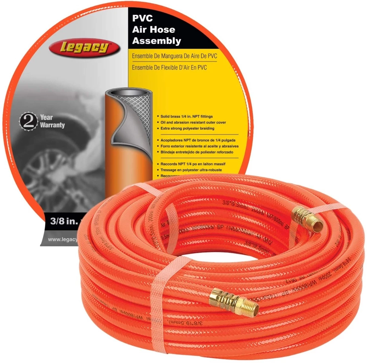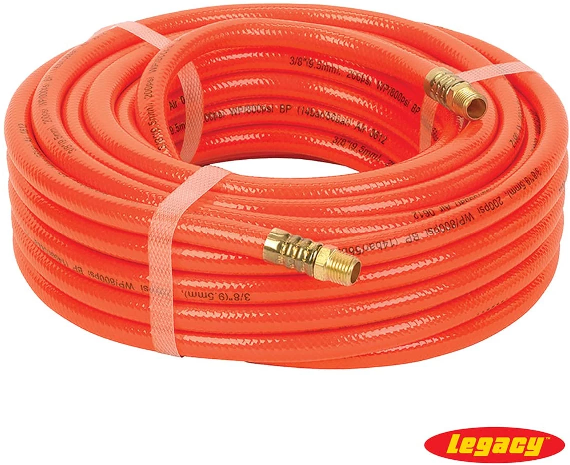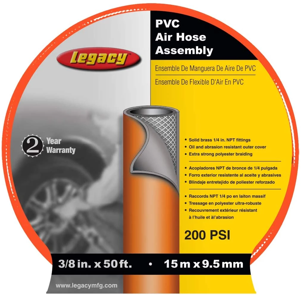 Workforce® Series PVC air hose is made from virgin resin PVC giving it excellent flexibility and low temperature resistance. The outer cover also uses virgin resin PVC that is UV, oil and abrasion resistant. The inner tube is reinforced with extra strong polyester braiding. 20% less weight per foot than comparable rubber hoses. Resists checking, cracking and fading. If coupling, use crimped-on fittings only. Reusable fittings not recommended.
