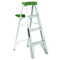 This Louisville 4 foot lightweight aluminum step ladder has a load capacity of 225lb, rated ANSI Type II. This ladder is equipped with a molded top with handyman’s tool slots, molded pail shelf, slip-resistant rubber feet, steel gusset bracing, and pinch-resistant spreader braces. This ladder is ideal for painting.