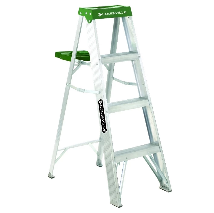 This Louisville 4 foot lightweight aluminum step ladder has a load capacity of 225lb, rated ANSI Type II. This ladder is equipped with a molded top with handyman’s tool slots, molded pail shelf, slip-resistant rubber feet, steel gusset bracing, and pinch-resistant spreader braces. This ladder is ideal for painting.