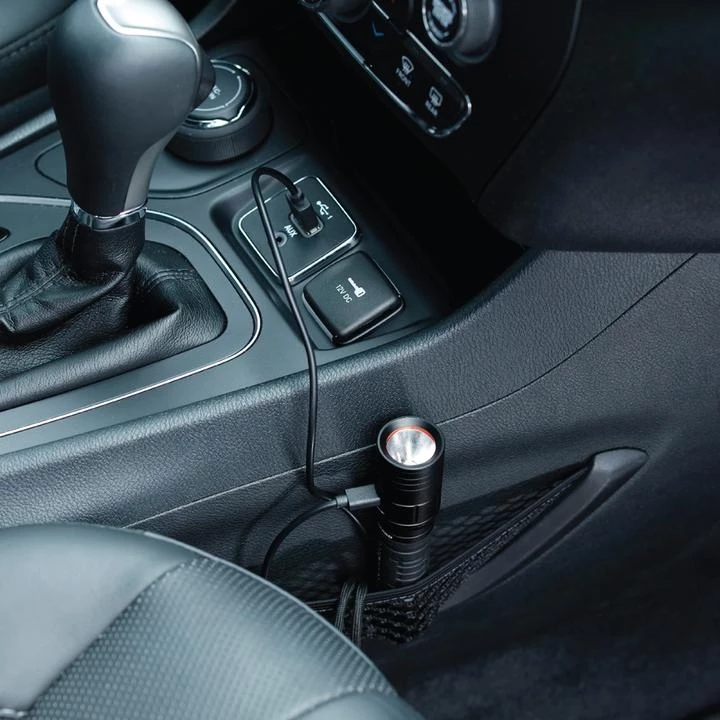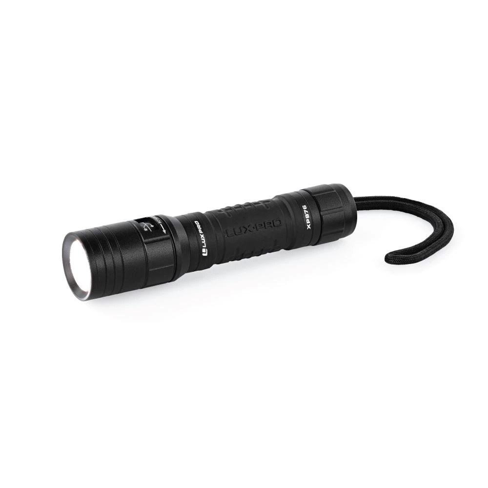 Pro Series 450 lumen LED rechargeable flashlight with TackGrip by LUXPRO. This rechargeable flashlight is compact, tactical and illuminates 450 bright lumens. There are 4 modes: High, Medium, Ultra-Low, and Hidden Strobe. With innovative electronics, users can turn the light off with one click after using the selected mode for more than 5 seconds. The hidden strobe has an access/exit feature by pressing the on/off button for approximately 3 seconds. This light comes equipped with a built-in Lithium-ion 3.7V 1800mAh rechargeable battery and includes a micro-USB cable for convenient charging. Run times are excellent with 2.5 hours when all 450 lumens are at work and over 19 hours on Ultra-Low mode, which still offers 30 usable lumens of light. This flashlight features LUXPRO’s patented TackGrip that is molded directly to the aluminum body for added durability and handling comfort. It also comes with a wrist lanyard for a secure hold. It’s made sturdy with aircraft grade anodized aluminum and has a sleek black matte finish. For additional peace of mind, this rechargeable tactical light comes with a Limited Warranty against Manufacturer’s Defects.