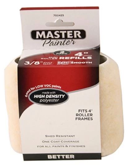 2 Pack, Size: 4″ Roller cover 3/8″ Nap Good coverage and finish. For use with all paints and finishes on semi smooth surfaces.
