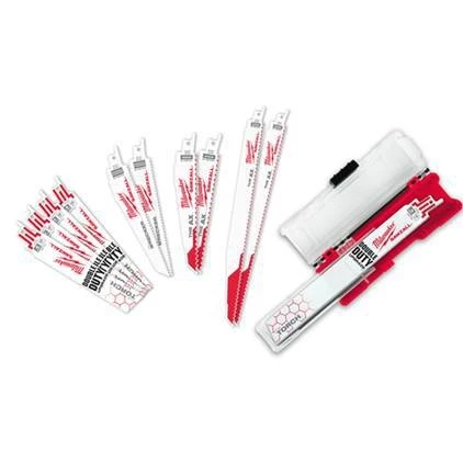 The Milwaukee® 12 piece Sawzall® blade set features an assortment of our most popular demolition blades for a broad range of professional applications. Milwaukee® demolition blades are thicker for maximum durability and taller for straighter cuts.