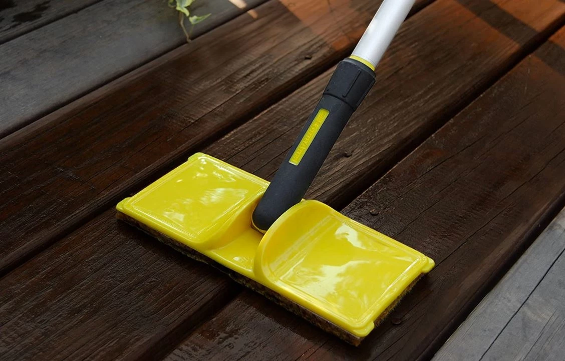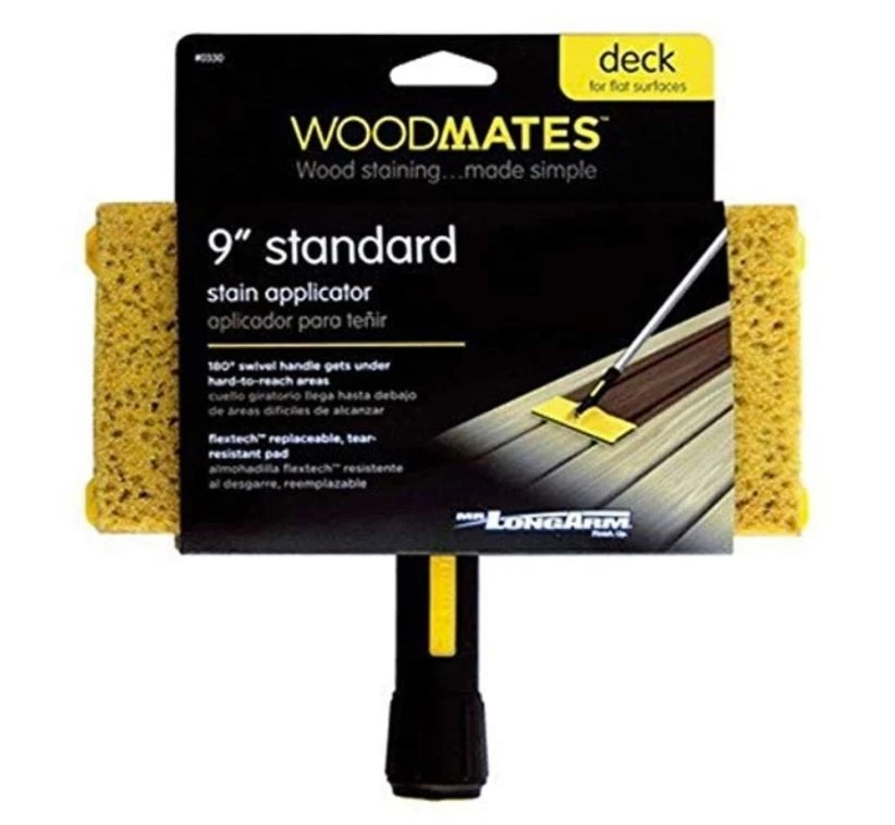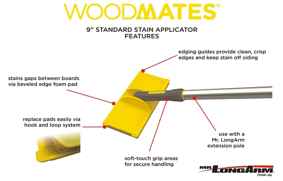 The standard stain applicator features a pivot head that makes staining a breeze and allows the beveled pad to be used as a gap tool. Our Flextech foam pad is highly tear-resistant, easily replaceable and releases more stain to cover more board feet in less time. Edging guides provide clean, crisp edges and keep stain off siding. The hook and loop system lets you zip pads off for easy cleaning and easily press them back in place. Use with an extension pole to make staining decks faster and easier.
