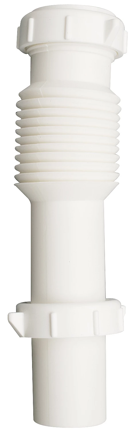 White polypropylene 7” slip joint or direct connect flex ‘n fix sink tailpiece with 1 1/2” inlet.