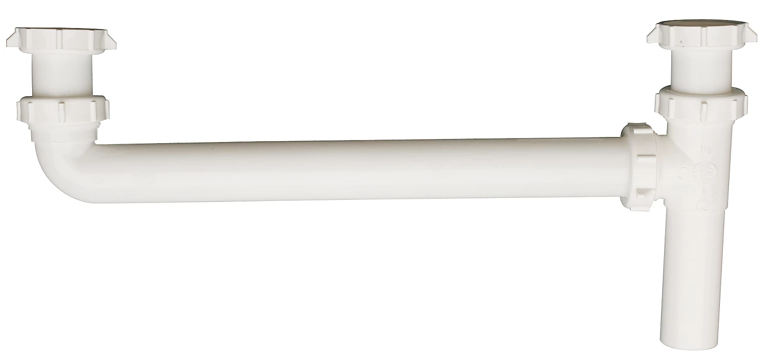 White polypropylene 16″ long end outlet continuous waste with slip joint or direct connect baffle tee.