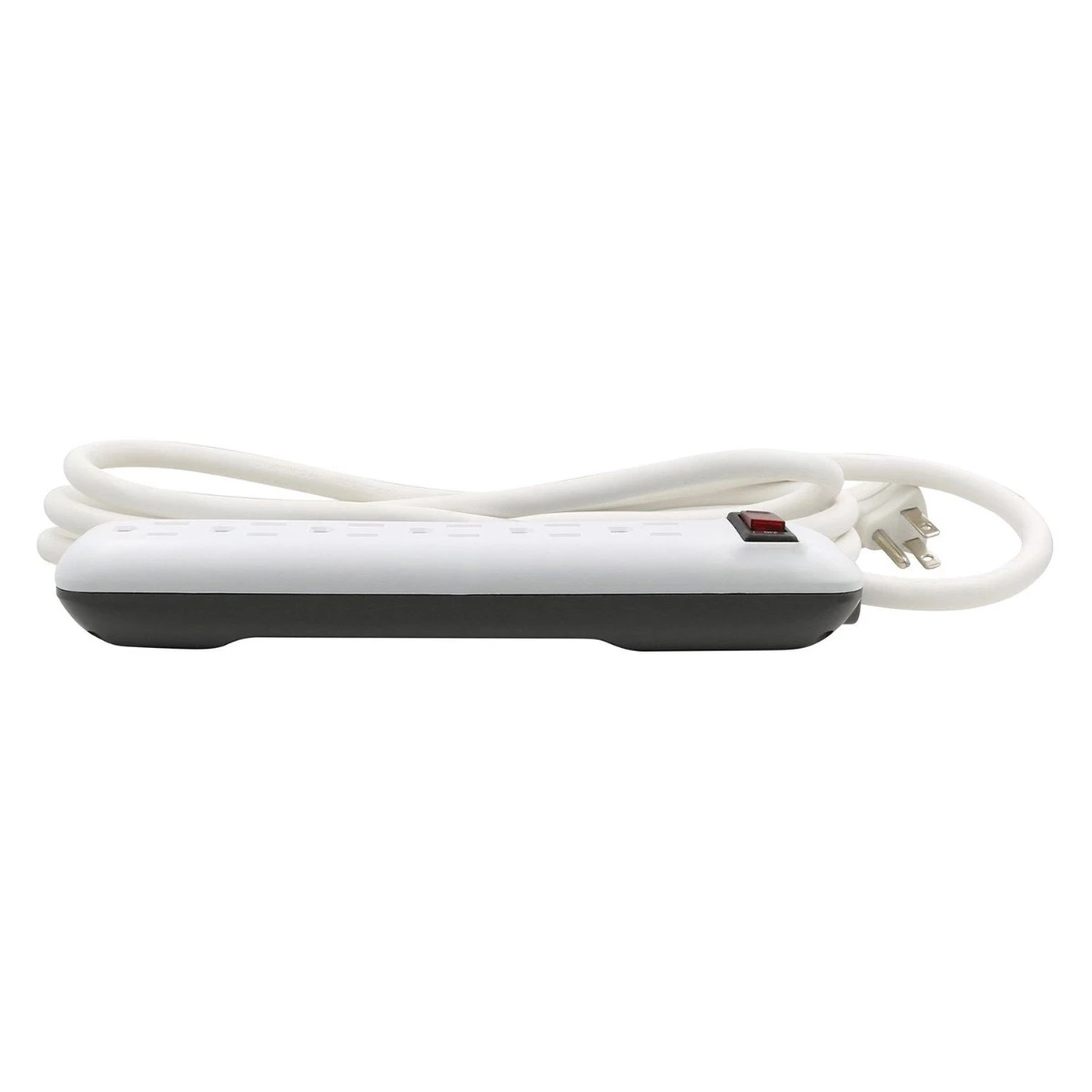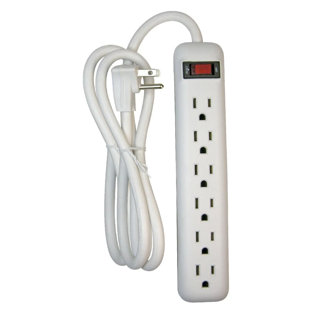 6-Outlet Power Strip with Cord (PB801115) by Prime®. Plug Type: Right Angle. Cord Length: 8′. Housing Material: ABS Plastic. Quantity: 1 Piece. Housing Color: Matte White/Gray. This 6-outlet power strip is compact enough for tight spaces but still looks stylish. The lighted on/off switch has a built-in resettable circuit breaker to protect against overloads. It also has a low-profile plug which enables furniture to be placed closer to the wall without damaging the cord.