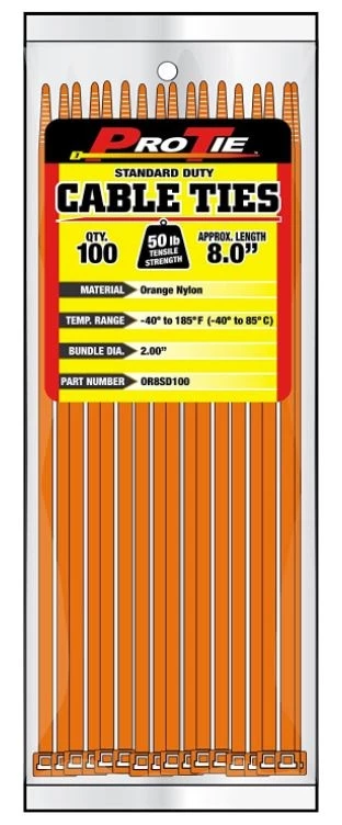 ProTie Orange Standard Duty Color cable ties are made from high strength and lightweight 6/6 nylon. Nylon 6/6 is a hygroscopic material, which absorbs and releases moisture, is non-toxic, and has a working temperature range of-40 to 185-Degree F (-40 to 85-Degree C).