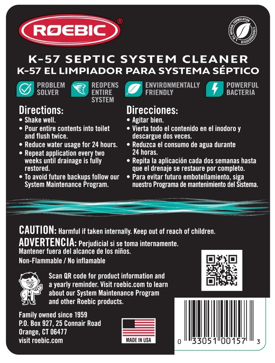 K-57 Septic System Cleaner is a powerful biological product which is formulated with our patented bacterial cultures. K-57 is powerful enough to act quickly in emergency situations where sluggish conditions, clogs, surface water accumulations, or back-ups have occurred.