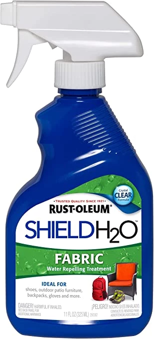 Rust-Oleum® Shield H2O™ Fabric is a one-step, super-hydrophobic, water repelling treatment designed to keep items dry longer. This crystal clear formula preserves outdoor items against damaging moisture without changing the look or feel of the fabric.