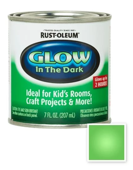 Rust-Oleum® Specialty Glow In The Dark glows for up to 2 hours. Apply to wood, metal, plaster, masonry or unglazed ceramic. Washes with soap and water.