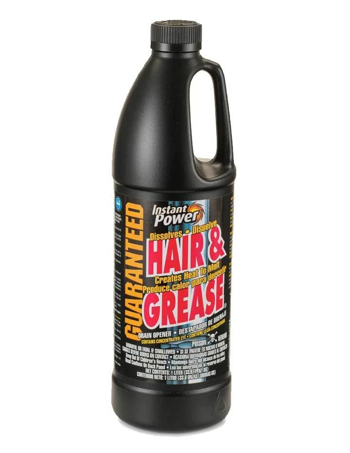 Our Instant Power Hair and Grease Drain Opener is the solution for the most common drain stoppages. This unique formulation dissolves hair clogs from bathroom drains and creates heat to melt grease from kitchen sinks. This is the strongest non-acid formulation on the market.