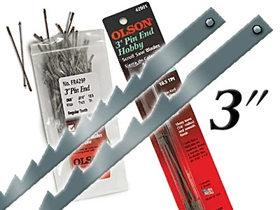3″ Pin End Hobby Blades measure 2-3/4″ between pins and are available with regular or skip teeth. They are used on Dremel® MotoSaw-(the older models), Sears Craftsman® Hobby Scroll Saw, Delta 15″ Hobby Scroll Saw and Emco Lux Hobby Saw to cut wood, plastic and thin mild metals and provide a medium smooth finish.